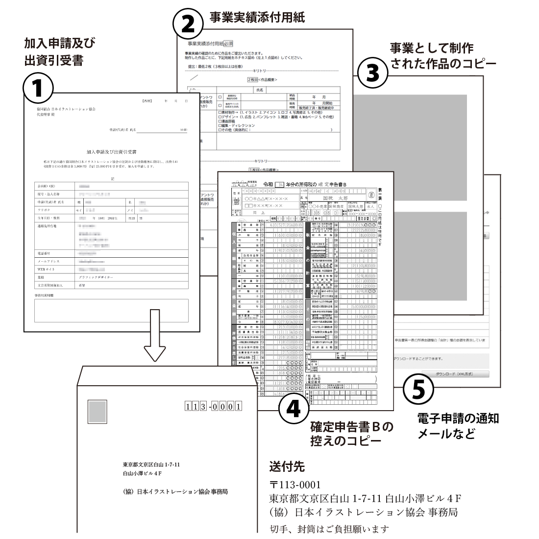 加入申請をいただいた方が上記の資格を満たしているかどうかを確認するため、公的な事業証明書として確定申告書 第一表控のコピーおよび、事業として制作されたイラストレーション作品等のご提出をお願いしています。